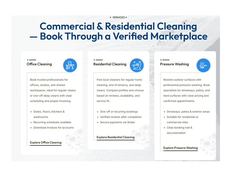 Operating via its dedicated website, the business provides a platform for booking and managing cleaning services, offering strong appeal for buyers seeking a scalable, low-overhead opportunity within the growing on-demand services sector. With a clear brand identity and digital infrastructure already in place, the platform is well-positioned for expansion through marketing, regional growth, or service diversification.